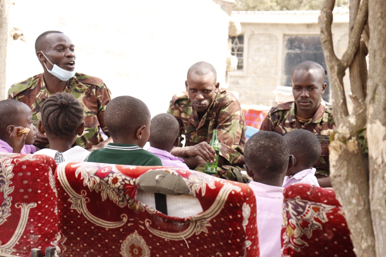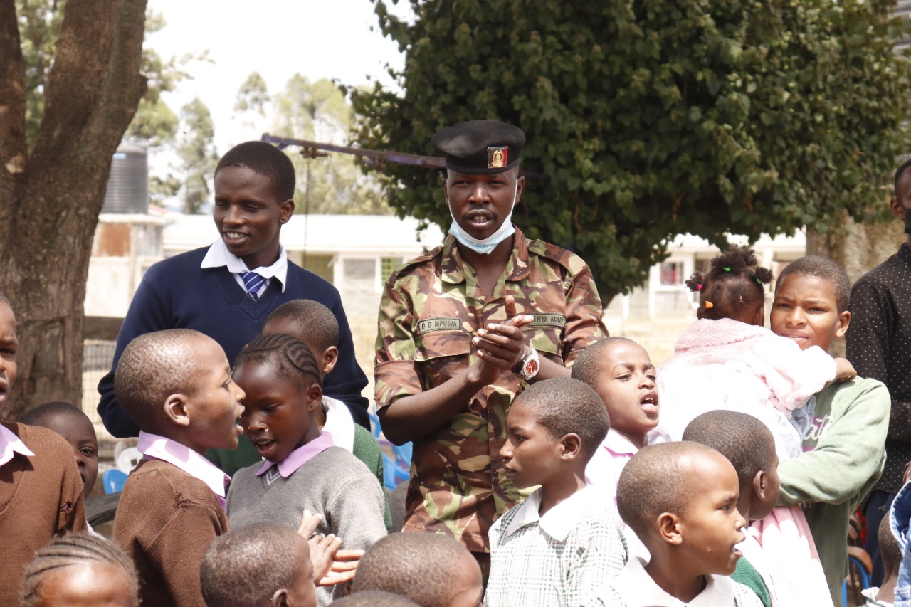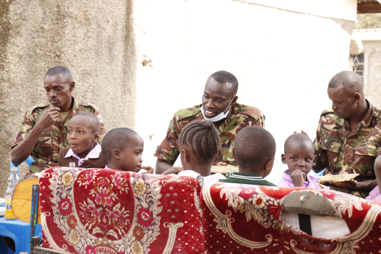 - The Officer Commanding Major Winstead Nyongesa thanked the institution management for the work they were doing in supporting the needy children, for allowing them to pay them a visit and for accepting the donations towards putting a smile on the faces of the young ones. The soldiers spent quality time playing with the children, prepared a meal for them and interacted in song and dance during the visit. They also urged the children to work hard and succeed, indicating that their background does not dictate their future.